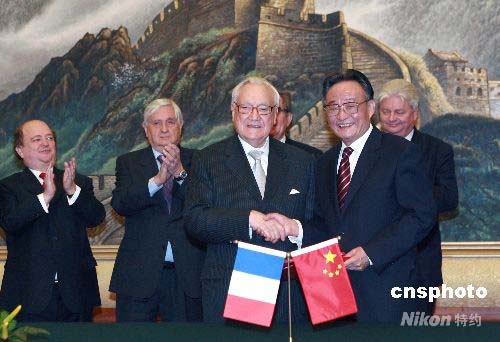 4月25日,全國人大常委會(huì)委員長吳邦國在北京人民大會(huì)堂與法國參議院議長蓬斯萊舉行會(huì)談。會(huì)后雙方簽署了中華人民共和國全國人民代表大會(huì)與法蘭西共和國參議院建立定期交流機(jī)制的協(xié)議。中新社發(fā) 廖文靜 攝