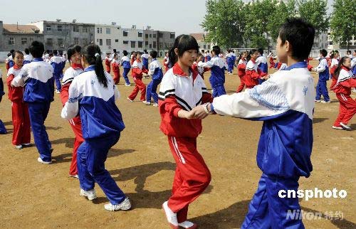 圖:山東棗莊中小學生跳起校園集體舞迎奧運(2)