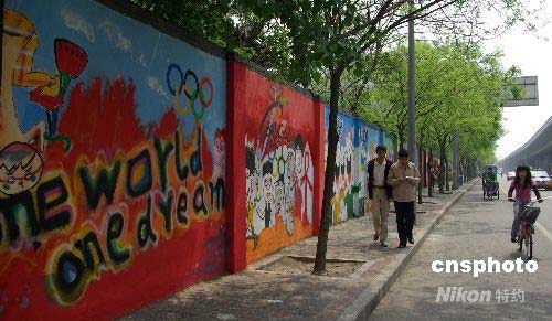 4月28日,北京第一面奧運文化墻亮相北京理工大學(xué)西校墻,這是市民用五顏六色的顏料和噴漆材料,在長約600米、高2米多的墻上,勾畫出70多幅個性鮮明、充滿奧運元素的涂鴉作品。作為北京市民參與奧運環(huán)境建設(shè)的重要標志,北京將在七城區(qū)繁華地段和高校周邊設(shè)立10面奧運文化墻。 中新社發(fā) 九州 攝
