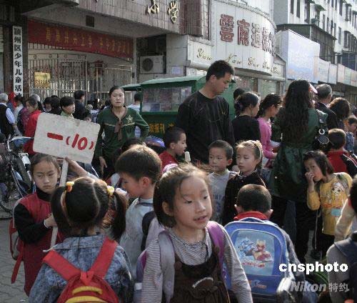 四月二十八日下午,阜陽市清河路小學(xué)一年級(jí)學(xué)生在排隊(duì)放學(xué)。安徽省阜陽市千余嬰幼兒童感染腸道病毒EV71后,當(dāng)?shù)卣扇〈胧┘訌?qiáng)救治,嚴(yán)守預(yù)防,減少擴(kuò)延。中新社發(fā) 張婭子 攝