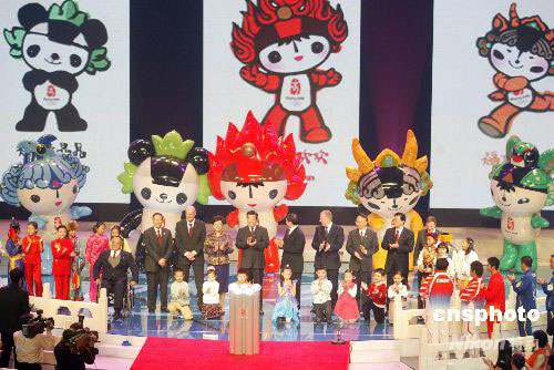 2005年11月11日晚,北京二零零八年奧運(yùn)會(huì)吉祥物發(fā)布暨倒計(jì)時(shí)一千天活動(dòng)在北京工人體育館舉行,五個(gè)吉祥物福娃貝貝、福娃晶晶、福娃歡歡、福娃迎迎、福娃妮妮隆重登場(chǎng)。作者:盛佳鵬