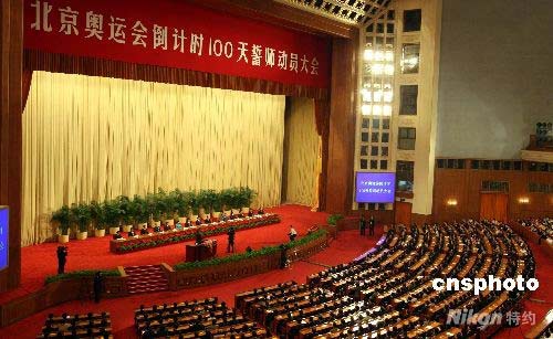 四月三十日,北京奧運(yùn)會(huì)倒計(jì)時(shí)100天誓師大會(huì)在人民大會(huì)堂舉行。 中新社發(fā) 任海霞 攝