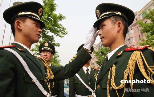 4月30日,北京飯店舉行迎奧運(yùn)倒計(jì)時(shí)100天千人簽字活動(dòng),北京飯店被國(guó)際奧委會(huì)正式確立為第29屆奧林匹克大家庭總部飯店,隨著2008北京奧運(yùn)會(huì)的臨近,飯店開(kāi)展了以?shī)W運(yùn)為目標(biāo)的服務(wù)技能比賽,投入到奧運(yùn)接待服務(wù)工作中。北京飯店千名員工,以及天安門(mén)國(guó)旗護(hù)衛(wèi)隊(duì)、中國(guó)人民解放軍軍樂(lè)團(tuán)參加奧運(yùn)倒計(jì)時(shí)100天儀式。 圖為在北京飯店奧運(yùn)倒計(jì)時(shí)100天儀式上天安門(mén)國(guó)旗護(hù)衛(wèi)隊(duì)?wèi)?zhàn)士整理軍容。 中新社發(fā) 錢(qián)興強(qiáng) 攝