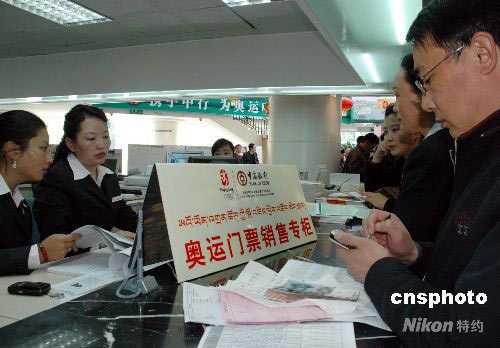 在西藏奧運(yùn)會門票銷售點的中國銀行西藏自治區(qū)分行里,購買奧運(yùn)會門票的市民排起了長長的隊伍。 中新社發(fā) 周波 攝