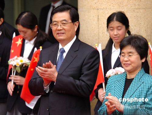 5月9日下午,正在日本進(jìn)行國事訪問的中國國家主席胡錦濤及夫人劉永清參觀了橫濱山手中華學(xué)校,受到該校全體師生的熱烈歡迎。圖為胡錦濤夫婦在歡迎儀式上。中新社發(fā) 朱沿華 攝
