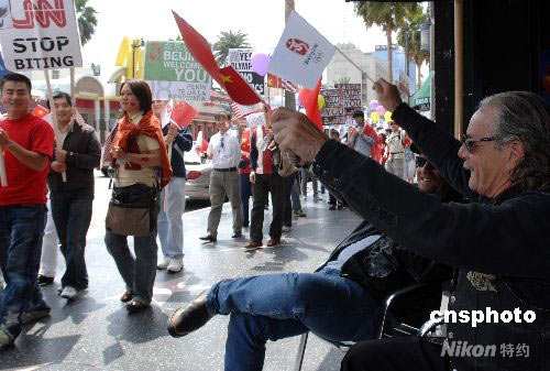 當(dāng)?shù)貢r間5月10日,通過網(wǎng)絡(luò)自發(fā)組織的南加州數(shù)百名華人華僑、留學(xué)生在洛杉磯著名的好萊塢星光大道上參加支持北京奧運(yùn)集會游行活動。游行活動在歡歌笑語中進(jìn)行,沿途受到一些洛杉磯市民的支持和響應(yīng)。 中新社發(fā) 張煒 攝
