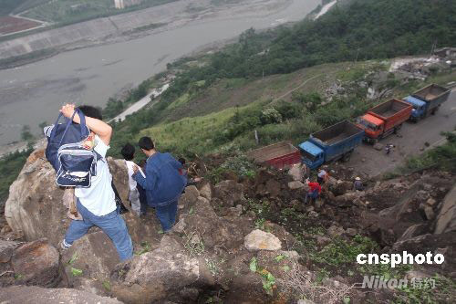 5月12日14時(shí)28分,四川汶川縣(北緯31度,東經(jīng)103.4度)發(fā)生7.8級地震,離都江堰市區(qū)5公里的水井灣大橋發(fā)生大面積塌方,通往汶川的道路全線阻擋。圖為困在塌方區(qū)域的居民前往安全區(qū)域。 中新社發(fā) 黃榮 攝