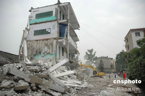 12日下午2:30左右,受四川汶川地震波及,重慶市梁平縣文化鎮(zhèn)一小學教學樓發(fā)生垮塌。13日凌晨1時許,搜救工作已全部結束,垮塌造成5人死亡,36人受傷。圖為垮塌后小學僅剩的幾間房屋。 中新社發(fā) 郭虹 攝