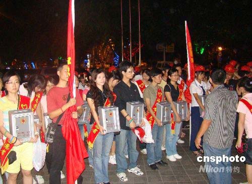 5月13日晚上八點(diǎn),由海南青年志愿者協(xié)會(huì)、省紅十會(huì)、志愿海南愛心分社和海南電視臺(tái)《鷯哥》欄目組織30多位自愿者,走上街頭為四川地震災(zāi)區(qū)募捐善款。圖務(wù)志愿者作出發(fā)募捐前的準(zhǔn)備。中新社發(fā) 付美斌 攝