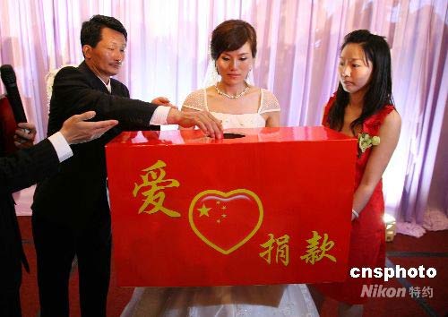 新娘邱媛媛和新郎饒新的家人在婚禮現(xiàn)場(chǎng)向四川災(zāi)區(qū)捐贈(zèng)2萬(wàn)元人民幣。中新社發(fā) 鐘山 攝