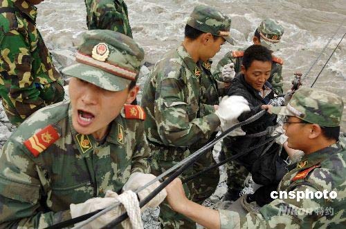 武警官兵在汶川岷江營救轉(zhuǎn)移地震災民(2)
