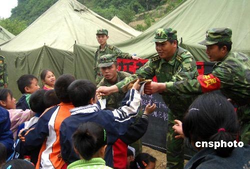 5月20日,四川省平武縣南壩鎮(zhèn)埡頭坪村,解放軍某裝甲師炮兵團在這里建立的“托起明天的太陽”災區(qū)戰(zhàn)地小學正式開課。 中新社發(fā) 汪景磊 攝