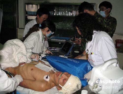 5月21日,四川省綿竹縣被埋8天8夜零4小時(196個小時)的天池煤礦礦工賴元平被救出,經(jīng)解放軍255醫(yī)院醫(yī)療隊急救后由成都軍區(qū)直升飛機接至成都軍區(qū)總醫(yī)院救治。傷者在該院作CT檢查時被發(fā)現(xiàn)腦有內(nèi)巨大血腫,時刻有生命危險,成都軍區(qū)總醫(yī)院顧建文副院長和解放軍301總醫(yī)院周定標教授研究后決定立即手術。手術由顧建文副院長主刀,1小時40分鐘后手術完成,術后傷員生命體癥平穩(wěn)。中新社發(fā) 朱琥姚遠 攝