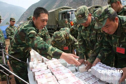 5月22日,第二炮兵某技術(shù)總隊政委高海華將620多萬元人民幣金庫庫款、重要資料等清單移交給了綿陽市農(nóng)村信用聯(lián)社負責人陳利雄。四川省北川縣信用聯(lián)社八層大樓,是北川縣損壞最嚴重的建筑之一,里面不但埋有多名工作人員,而且還有存放大量資金的國家金庫。5月15日上午,第二炮兵某技術(shù)總隊接到任務后,立即組織了由86名專業(yè)技術(shù)骨干組成的搜救隊,攜帶挖掘機、切割機、生命探測儀等設(shè)備火速趕往該聯(lián)社進行被埋人員和金庫庫款的搶救。共營救出9名幸存者,并于21日晚成功搶救出金庫庫款620多萬元和大量寶貴資料。圖為救援人員認真清點現(xiàn)金。中新社發(fā) 陳雙維 攝