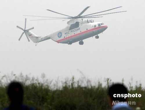 5月25日下午5時(shí)45分,俄羅斯米格—26大型運(yùn)輸機(jī)飛抵綿陽(yáng)機(jī)場(chǎng),支援唐家山堰塞湖排險(xiǎn)工作。中新社發(fā) 趙振清 攝