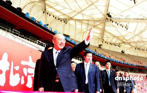 圖:中國(guó)國(guó)民黨主席吳伯雄一行參觀"鳥(niǎo)巢"