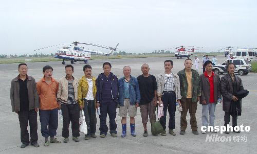 5月29日下午,被困17天的10名清平磷礦礦工,被民航直升機救出。剛走下飛機的被救礦工付學斌說,這17天來靠吃野菜和直升機空投的食品維持生命。5月12日那天,地震時他們都在磷礦上班,傷亡不是很大,主要是在家的親人都被這次地震給吞沒了。執(zhí)行這次營救任務(wù)的是中信海直的AS332型7961號和東方通用航空的米171型7856號飛機。據(jù)民航直升機抗震指揮部副總指揮關(guān)立欣講,受天氣影響,全天共出動直升機10架次,執(zhí)行飛行任務(wù)24架次,運進救災(zāi)物資10.1噸,救援人員13人,接運出被困群眾和傷員47人,財務(wù)檔案600公斤。中新社發(fā) 張鈺昱 攝