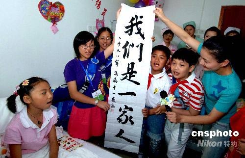 5月31日,來福州參加“海峽兩岸手拉手藝術(shù)節(jié)”的臺灣澎湖馬公小學(xué)音樂班的洪儀庭、許宜彙、林宏珍3位同學(xué)與福州小朋友,一起來到南京軍區(qū)福州總醫(yī)院愛心病房,與在這里接受治療的四川地震災(zāi)區(qū)的小朋友共同舉行一場別開生面的聯(lián)歡活動,提前歡度“六一”兒童節(jié)。中新社發(fā) 劉可耕 攝