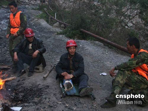 從一名被營救者口中得知有三名礦工被困礦區(qū)后,中國空降兵某部特種大隊于5月31日上午,乘坐香港特區(qū)政府飛行服務隊的直升機前往綿竹清平鄉(xiāng)山里搜救3名川龍有限公司的礦工。當日兩名受傷礦工被找到。由于天氣原因,6月1日才被飛機運出。圖為礦工被救后等待飛機救援。中新社發(fā) 李磊 攝