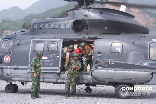 圖為香港特區(qū)政府飛行服務(wù)隊(duì)一架直升機(jī)載著獲救礦工降落在四川廣漢機(jī)場。中新社發(fā) 潘其武 攝