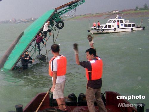 2008年6月4日,據(jù)湖北枝江市海事局(處)消息,6月3日18時20分,長江中游干線湖北枝江段突發(fā)強風(fēng)暴并伴暴雨冰雹,造成在枝江市五碼頭附近水域的一條客渡船和一條漁船翻沉,16人落水,9人獲救,7人失蹤。另據(jù)枝江市政府稱,此次強風(fēng)暴造成枝江市馬家店、百里洲、仙女、董市4個鄉(xiāng)鎮(zhèn)電力中斷,江面風(fēng)力達10級,20分鐘左右降雨達37毫米,冰雹最大直徑9毫米;枝江城區(qū)部分電線桿被刮倒,枝江全城停電。目前,枝江海事部門仍在全力搜救失蹤人員。中新社發(fā) 劉君鳳 攝