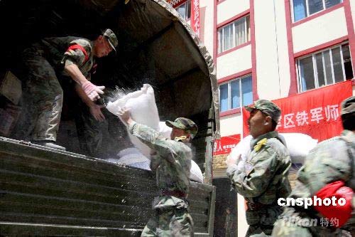 鐵軍救災(zāi)物資運(yùn)輸隊(duì)的車(chē)隊(duì)向理縣藏、羌族居住的高原山寨運(yùn)送救災(zāi)物資。中新社發(fā) 曾憲平 攝
