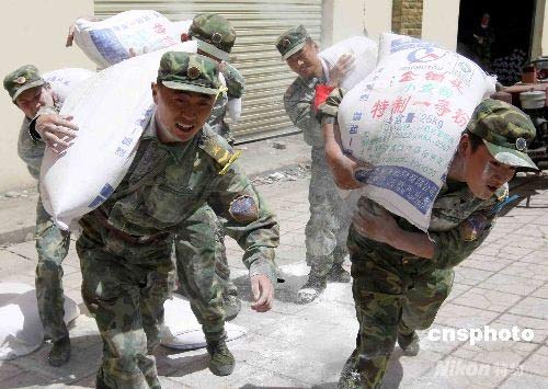 鐵軍救災(zāi)物資運輸隊的車隊將救災(zāi)物資送達理縣藏、羌族居住的高原山寨。中新社發(fā) 曾憲平 攝