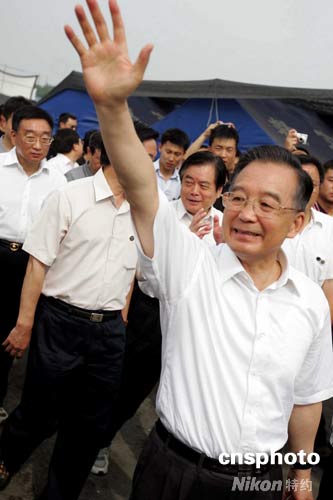6月6日,國務(wù)院總理溫家寶到四川綿陽涪城區(qū)疏散安置點(diǎn)慰問受災(zāi)民眾。 中新社發(fā) 杜洋 攝