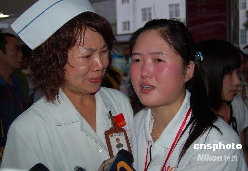 來(lái)自四川綿陽(yáng)的傷員劉小紅與照顧她的一名護(hù)士灑淚分別。中新社發(fā) 劉萬(wàn)強(qiáng) 攝