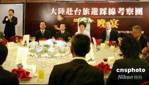 六月十六日,大陸赴臺(tái)旅游踩線考察團(tuán)一行抵達(dá)臺(tái)北。當(dāng)晚,臺(tái)灣海峽兩岸觀光旅游協(xié)會(huì)在臺(tái)北市晶華酒店設(shè)歡迎晚宴款待考察團(tuán)。中新社發(fā) 許曉青 攝