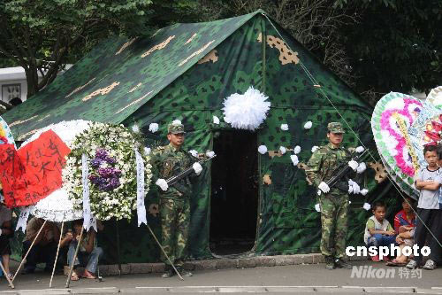 汶川地震災(zāi)區(qū)四川都江堰市胥家鎮(zhèn),在抗震救災(zāi)中犧牲的武文斌的簡(jiǎn)易靈堂前擠滿了數(shù)萬前來悼念的民眾。中新社發(fā) 曾憲平 攝