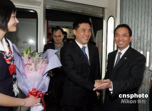 6月23日下午,臺(tái)北市長(zhǎng)郝龍斌抵達(dá)上海浦東國(guó)際機(jī)場(chǎng),開(kāi)始對(duì)上海進(jìn)行為期5天的訪問(wèn),這是新中國(guó)成立以來(lái),臺(tái)北市長(zhǎng)首次訪問(wèn)上海。圖為上海市臺(tái)辦主任楊建榮(右)到機(jī)場(chǎng)迎接。中新社發(fā) 潘索菲 攝