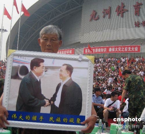 綿陽一受災(zāi)老嫗手捧胡溫合影觀看慰問演出