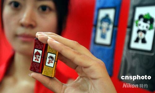 七月二日,北京2008年奧運特許商品奧運吉祥物電子紀(jì)念章、聯(lián)想火炬閃存盤等正式推向市場。特別是聯(lián)想奧運吉祥物閃存盤由于價格適中、實用性強(qiáng),一上市就受到消費者的喜愛。 中新社發(fā) 任海霞 攝