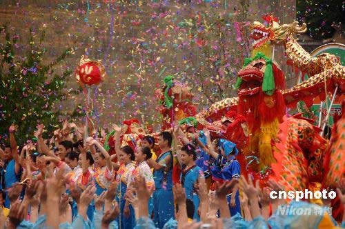 7月10日下午,在福建龍巖永定縣洪坑土樓景區(qū)舉行的《激情廣場-情動永定土樓》大型客家歌會上,永定縣的客家青年勁舞盤龍,慶賀中國福建(永定)土樓客家文化節(jié)和龍巖市第六屆旅游節(jié)舉行。中新社發(fā) 鄭祚聲 攝
