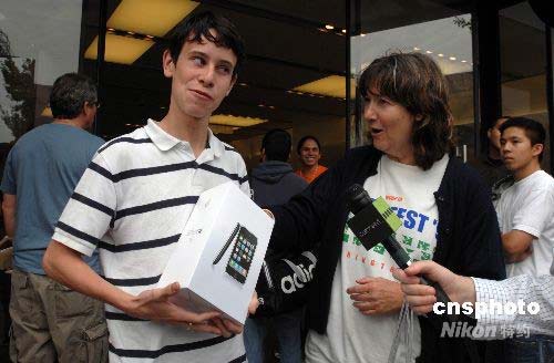 當(dāng)?shù)貢r間7月11日上午,上千名顧客在加州帕薩迪納市的一家蘋果專賣店排隊搶購新上市的3G版IPHONE手機,首位買到手機的顧客palmigiano得意洋洋地展示“戰(zhàn)利品”。中新社發(fā) 張煒 攝