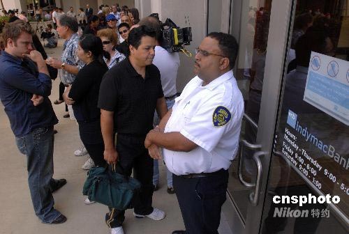 當地時間7月14日上午,數百名儲戶在加州帕薩迪納市的“因迪美聯邦銀行”門口排隊等待提取現金。 受次貸危機影響,6月底以來,美國最大的抵押貸款商因迪美銀行(IndyMac Bank)遭客戶擠兌,在11天內被客戶提走現金13億美元,本月11日,因流動性嚴重不足,該銀行被美國儲蓄管理局勒令關閉,并將其業(yè)務轉交至聯邦存款保險公司運營,該銀行成為美國次貸危機以來被關閉的最大抵押貸款商。被接管并更名后的“因迪美聯邦銀行”14日開始營業(yè),大批客戶仍擔心財產受損,一大早便排隊等待提現。中新社發(fā) 張煒 攝