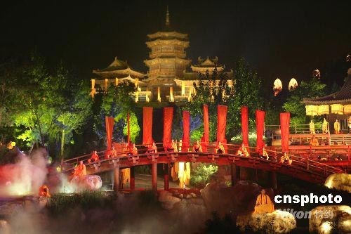 7月14日晚,一部名為《禪宗少林》的音樂大典在河南登封的嵩山實景演出,參加演出的演員達(dá)600人。《禪宗少林》由著名音樂家譚盾擔(dān)任藝術(shù)總監(jiān)和音樂原創(chuàng),梅帥元任導(dǎo)演。演出地點位于距嵩山少林寺7公里處的一片峽谷中,分為《水樂》《木樂》《風(fēng)樂》《光樂》《石樂》五個樂章,吸引眾多游客觀看。該節(jié)目將成為中原文化旅游的一大亮點。中新社發(fā) 趙雋 攝