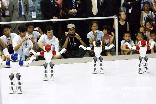 7月16日,2008機(jī)器人世界杯賽在蘇州國(guó)際博覽中心舉行,約有來(lái)自30個(gè)國(guó)家的300多支隊(duì)伍的1400多名參賽者及學(xué)者參加此次比賽和學(xué)術(shù)研討會(huì)。據(jù)悉,本屆機(jī)器人世界杯賽是首次在中國(guó)舉辦,同時(shí)也開(kāi)創(chuàng)了在發(fā)展中國(guó)家舉辦機(jī)器人世界杯賽的先河。中新社發(fā) 徐志強(qiáng) 攝