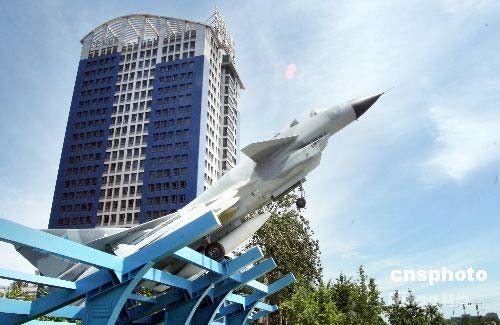 2008年7月17日,殲十飛機(jī)景觀工程在中國航空工業(yè)第一集團(tuán)公司總部前“一航花園”隆重揭幕。這標(biāo)志著殲十飛機(jī)景觀工程正式落戶朝陽CBD。這架殲十是完全根據(jù)真機(jī)的一比一高仿模型,機(jī)上細(xì)節(jié)分毫畢現(xiàn)。殲十作出大仰角爬升的姿態(tài),翼下掛有國產(chǎn)雷石6滑翔制導(dǎo)炸彈、霹靂9C近距格斗空空導(dǎo)彈及霹靂12中距空空導(dǎo)彈。中新社發(fā) 博芽影像 攝