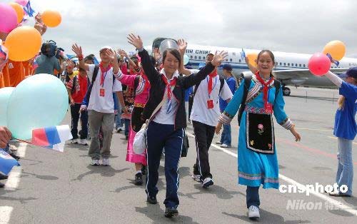 7月17日下午,首批中國四川地震災(zāi)區(qū)中小學(xué)生療養(yǎng)團(tuán)的364名孩子們抵達(dá)俄羅斯濱海區(qū)符拉迪沃斯托克(海參崴),進(jìn)行為期3周的康復(fù)療養(yǎng)。圖為第一次踏上了俄羅斯土地的災(zāi)區(qū)孩子們臉上露出了久違的笑容。中新社發(fā) 田冰 攝