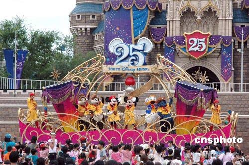 圖為在迪斯尼樂園內(nèi)舉辦的大型慶祝開園25周年表演吸引了大量游客前來觀看。