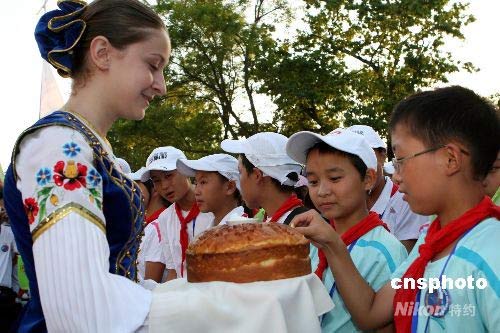 圖:俄羅斯傳統(tǒng)禮儀迎接中國地震災(zāi)區(qū)孩子