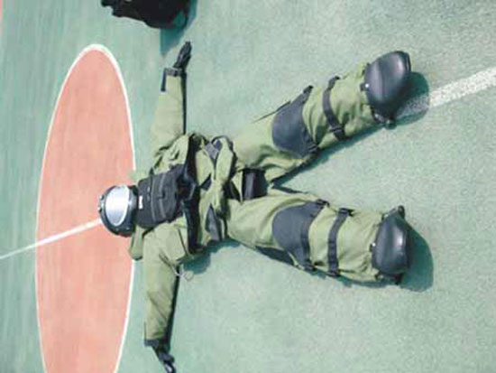 排爆服能夠防護(hù)爆炸后產(chǎn)生的超壓、碎片、沖擊波,對(duì)排爆專(zhuān)家進(jìn)行全方位的保護(hù)。其頭盔里,裝有智能型電池驅(qū)動(dòng)電源系統(tǒng)和排風(fēng)系統(tǒng),還有智能式聲音放大器及巨響防護(hù)裝置。排爆服“躺”在地上,就像一個(gè)人。它是目前世界上最先進(jìn)的防爆服,歷經(jīng)5年時(shí)間在全新平臺(tái)上研制出來(lái),具備最新的模塊化防護(hù)組合,提供更高的防護(hù)能力。它的配置更加齊全,腕部配有頭盔遙控器,調(diào)節(jié)和控制更加方便。頭盔面罩可以掀起,頭盔上方配備高亮度發(fā)光二極管照明燈,操作更加方便。一米范圍內(nèi),500克炸藥爆炸不會(huì)危及排爆者的生命。
