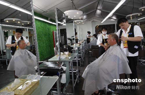 7月29日,入駐北京奧運村的村民,在美容區(qū)理發(fā)。 中新社發(fā) 杜洋 攝