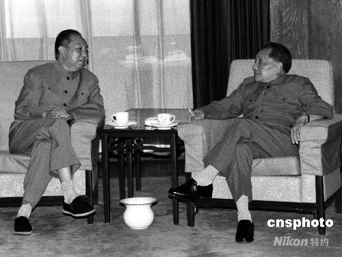 曾擔(dān)任中國共產(chǎn)黨和國家重要領(lǐng)導(dǎo)職務(wù)的華國鋒,因病醫(yī)治無效,于2008年8月20日12時(shí)52分在北京逝世,享年87歲。資料圖為1987年,鄧小平與華國鋒在出席全國人民代表大會全體會議期間在休息室交談。中新社發(fā) 呂相友 攝