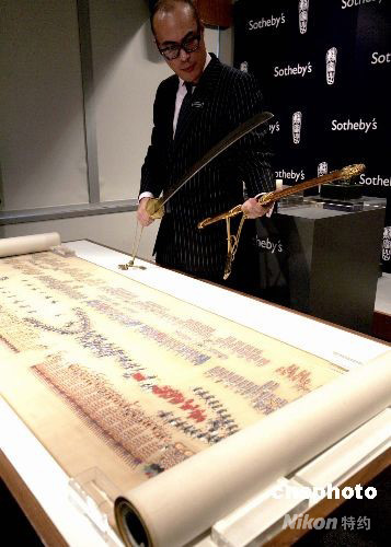 專家正在介紹珍稀乾隆御制《大閱第三圖 閱陣》手卷,及清乾隆御制金桃皮鞘“天字十七號(hào)”“寶騰”腰刀。中新社發(fā) 張勤 攝