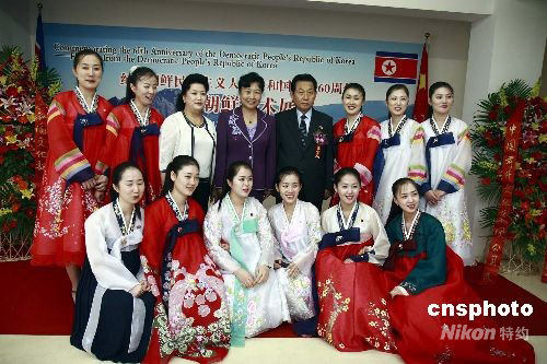 圖為中華人民共和國(guó)文化部文化部副部長(zhǎng)趙少華(二排左四)、朝鮮民主主義人民共和國(guó)駐華大使崔鎮(zhèn)洙(二排左五)等出席開(kāi)幕式。中新社發(fā) 邢利宇 攝