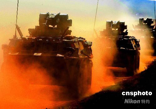 9月25日上午,中國人民解放軍“礪兵--2008”演習(xí)在塞北大漠展開。這場(chǎng)演習(xí)是一場(chǎng)在復(fù)雜地形、復(fù)雜電磁環(huán)境、作戰(zhàn)信息“背靠背”情況下,跨軍區(qū)聯(lián)合、多兵種協(xié)同、陸航空一體、實(shí)兵檢驗(yàn)性戰(zhàn)術(shù)集團(tuán)立體機(jī)動(dòng)攻防戰(zhàn)斗演習(xí)。中新社發(fā) 宋吉河 攝