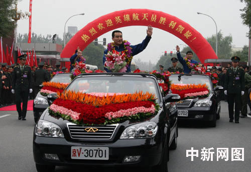 神舟七號(hào)飛船航天員翟志剛、劉伯明、景海鵬29日乘專(zhuān)機(jī)抵達(dá)北京后,當(dāng)日回到北京航天城,受到民眾的夾道歡迎。中新社記者 齊彬 攝